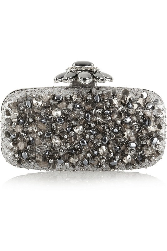Her silver satin box clutch is embellished with iridescent sequins, beads, and crystals and accented with a handcrafted floral clasp.