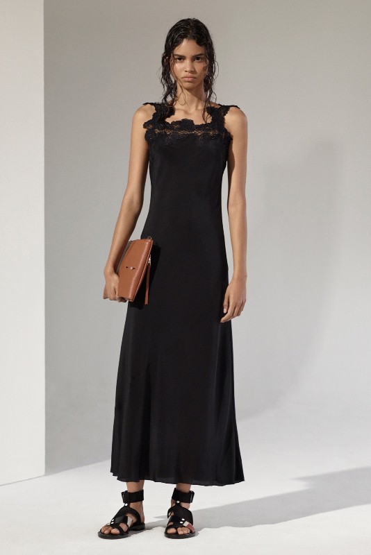 The iris prints were a pretty spin on classic florals, adorning a long-sleeve sheer-inset top, high-waist pleated maxi skirt, a floor-grazing dress with a deep-v neckline and a mesh-inset waist, functional, yet boldly-hued button front shirts, and two-tone mini skirts with sporty tie detailing. Trousers in the pattern paired with a long-line cardigan and matching v-neck sweater were the definition of relaxed and a sheer gown in the floral decoration will surely be seen on the red carpet slipped over some black undergarments by one of Hollywood’s most daring.