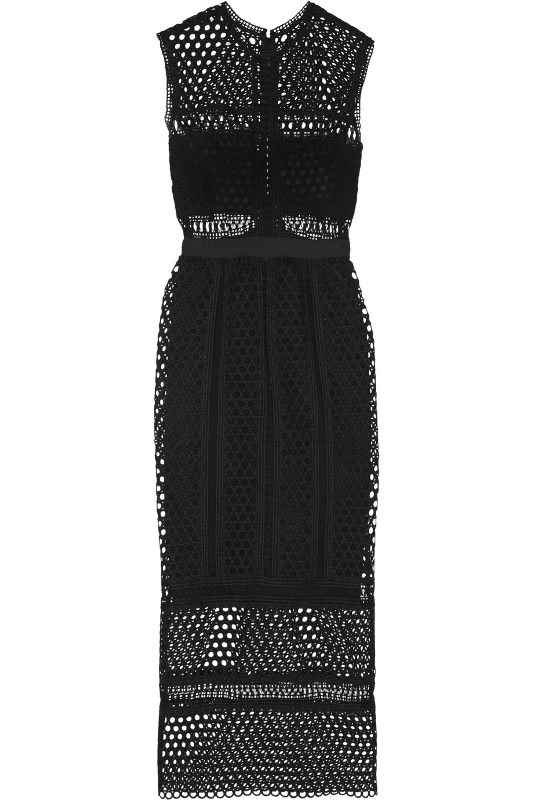 Her macramé lace LBD features a fitted bodice, nipped-in grosgrain waistband, and lining at the bust and skirt.