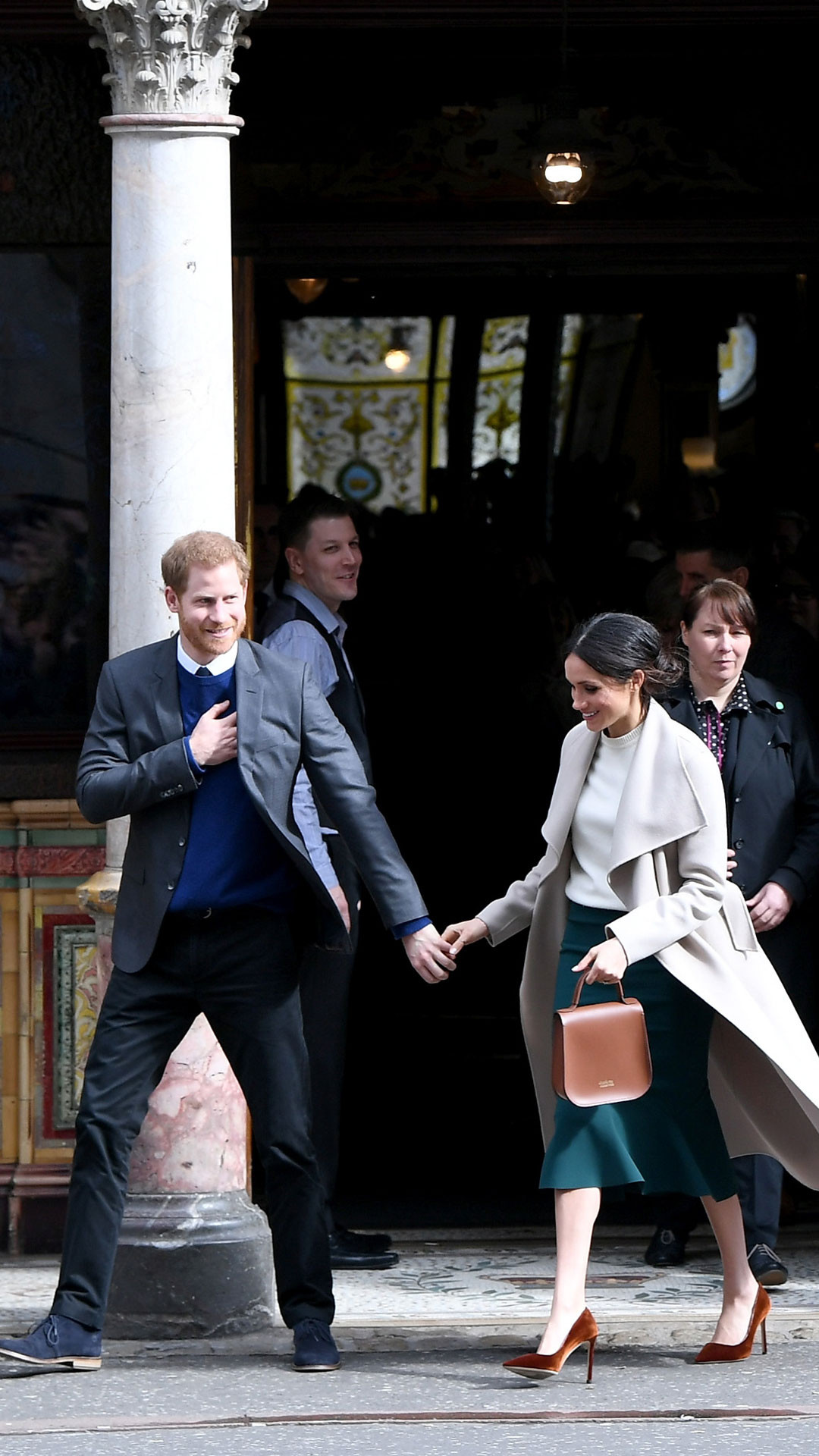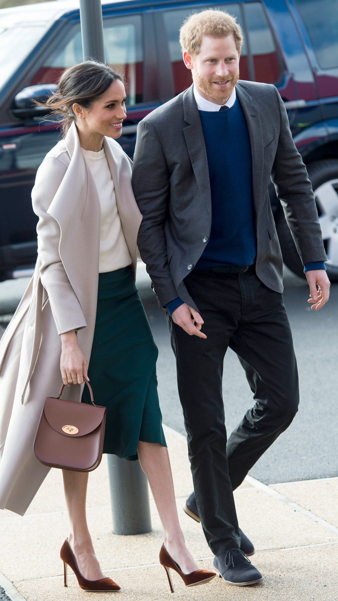 For the visit, Markle wore velvet Jimmy Choo heels, a Mackage coat, a Victoria Beckham sweater and a teal Greta Constantine skirt. She was also photographed holding a Charlotte Elizabeth purse while arriving at the event on Friday.