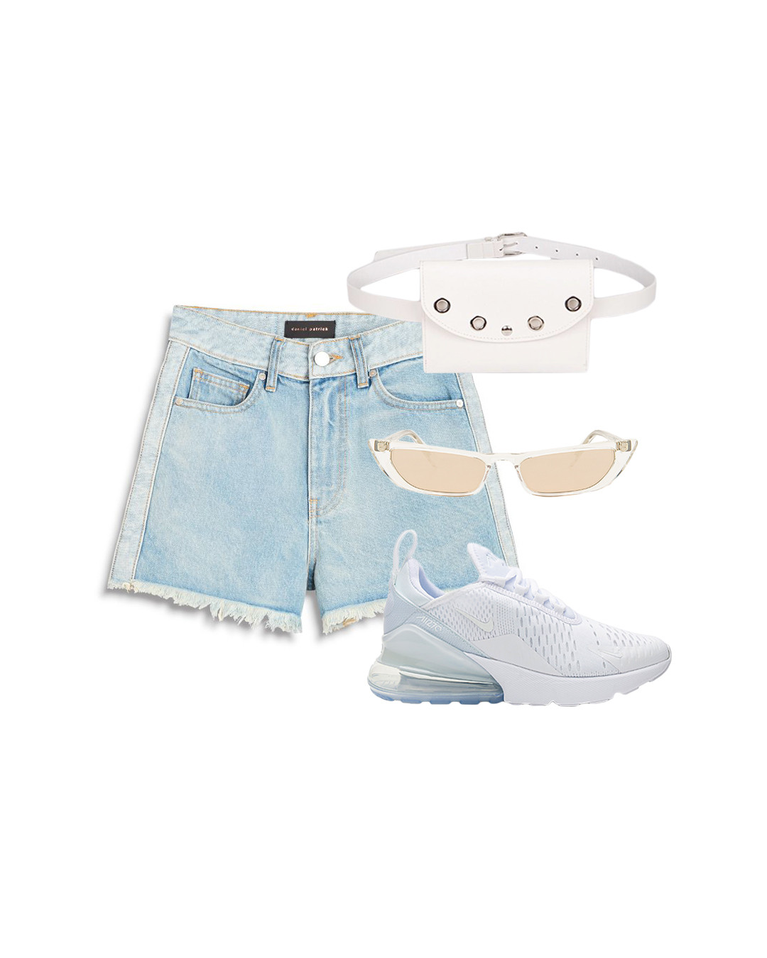 Daniel Patrick High Waisted Denim Shorts, $180; 12th Tribe White Rock the Stage Hip Belt, $38; Nike Air Max 270 Sneaker, $150; Kendall+Kylie Vivian Sunglasses, $58