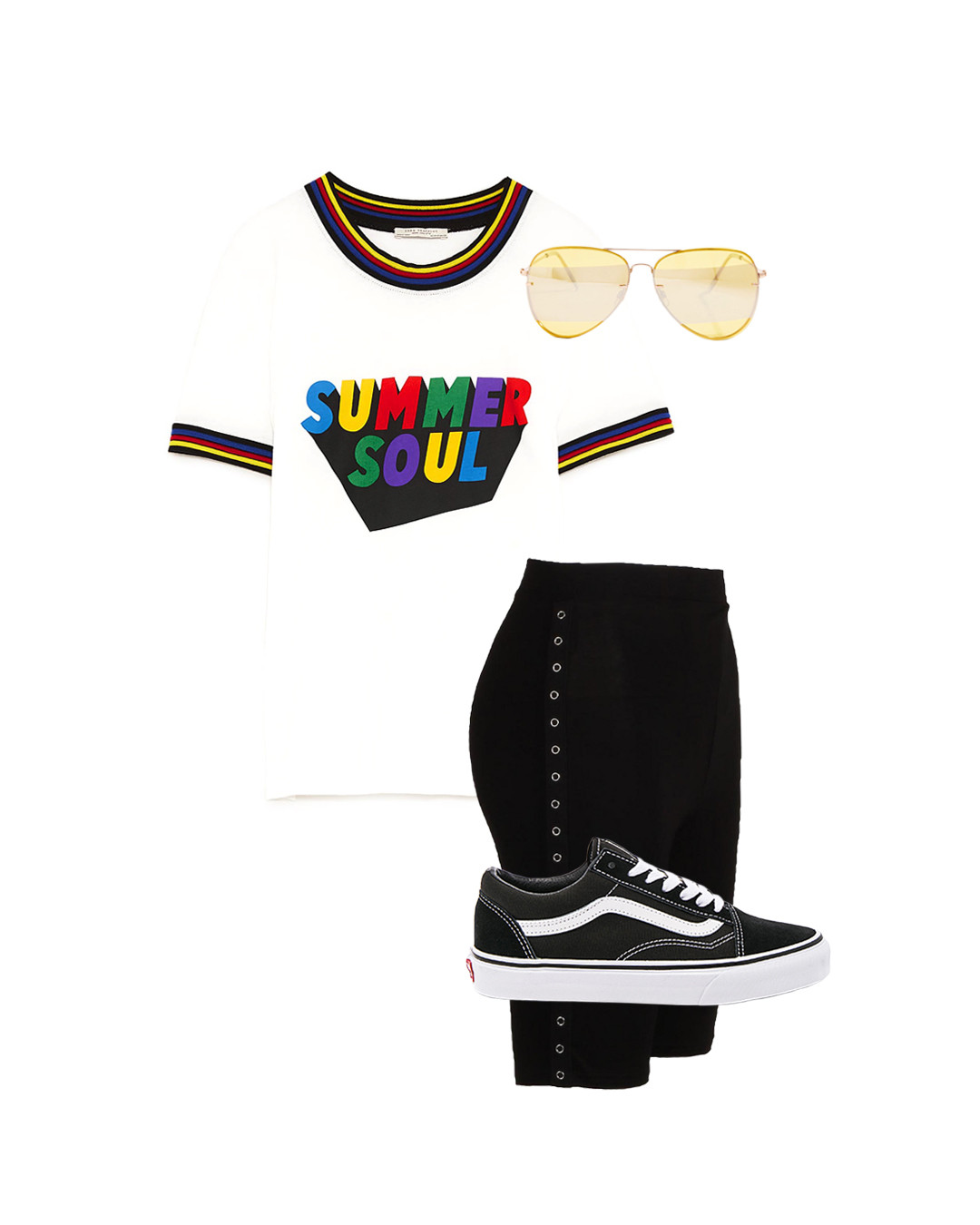 Zara Rib T-Shirt, $20; Topshop Stripe Lens Arnie Aviator Sunglasses, $38; Boohoo Zendaya Edit Eyelet Tape Cycling Shorts, $15; Vans Old Skool, $60