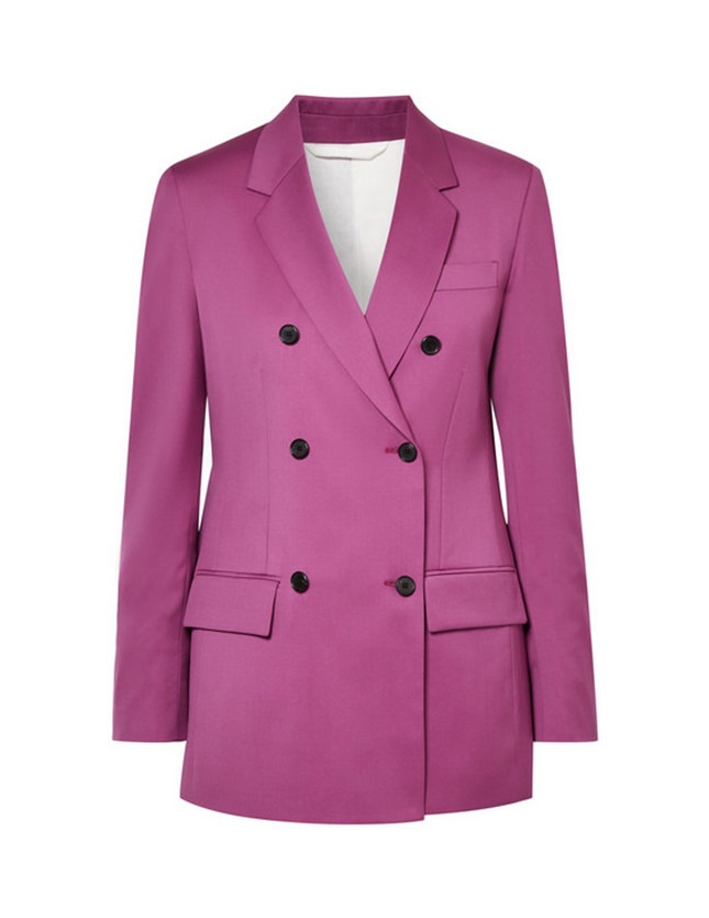 While floral print is popular during this time of year, it's the pleated blazer that takes her style to the next level. By pairing one of the brightest hues of her dress to her jacket, the print of the dress pops. The glasses and shoes, which are in the same color family, make it even more of a showstopper.