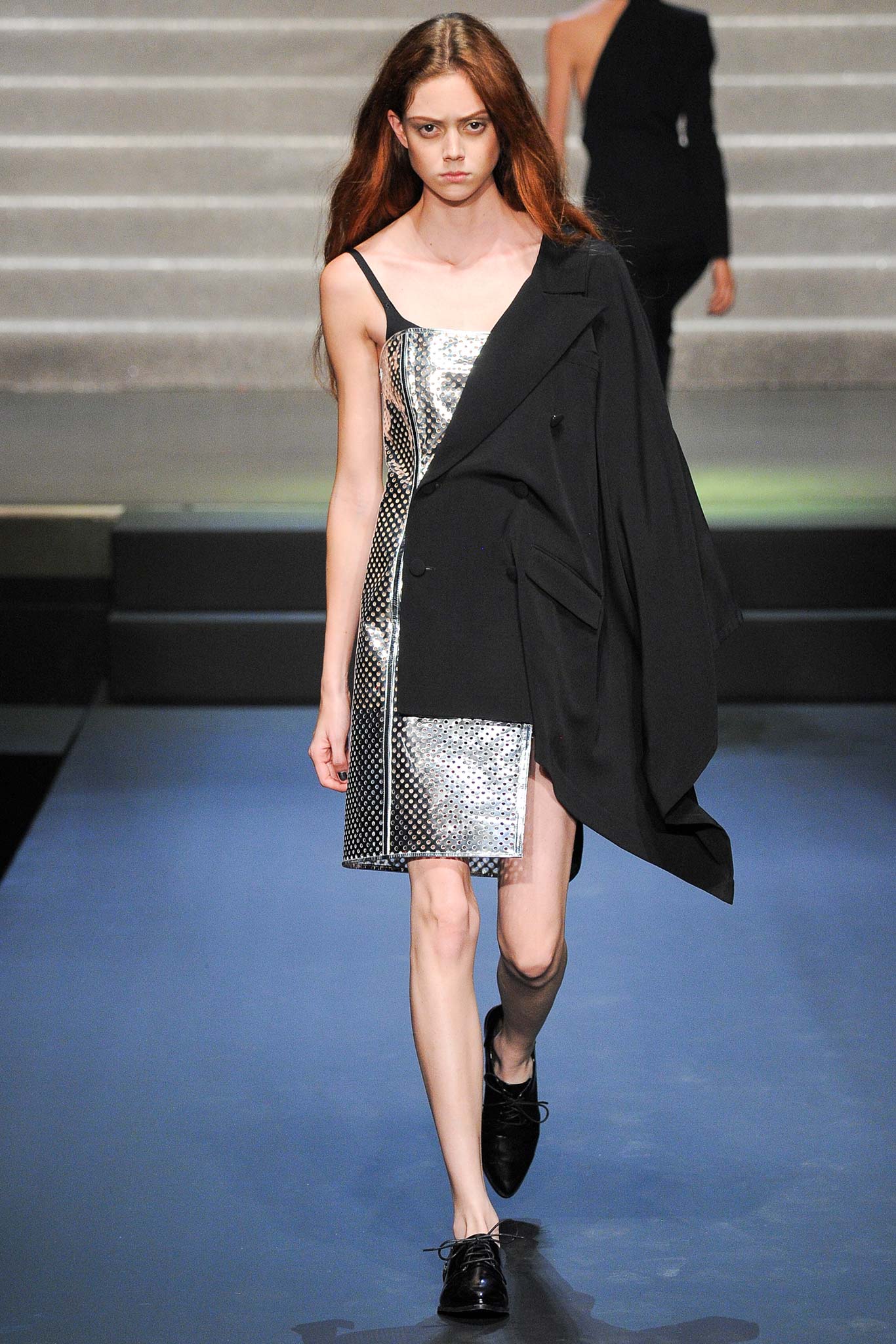 On the runway, her frock was layered under an asymmetrical blazer cape and anchored with lace-up brogues.