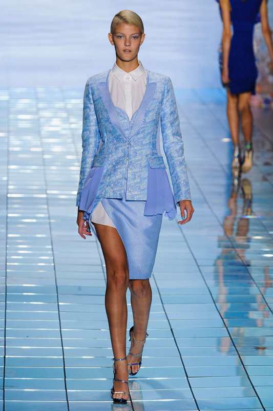 Zendaya Coleman gave a sultry spin to the suit at 2015 BeautyCon in a Lie Sangbong Spring 2015 Blue Textured Blazer, Bustier Crop Top, and Slit Skirt:
